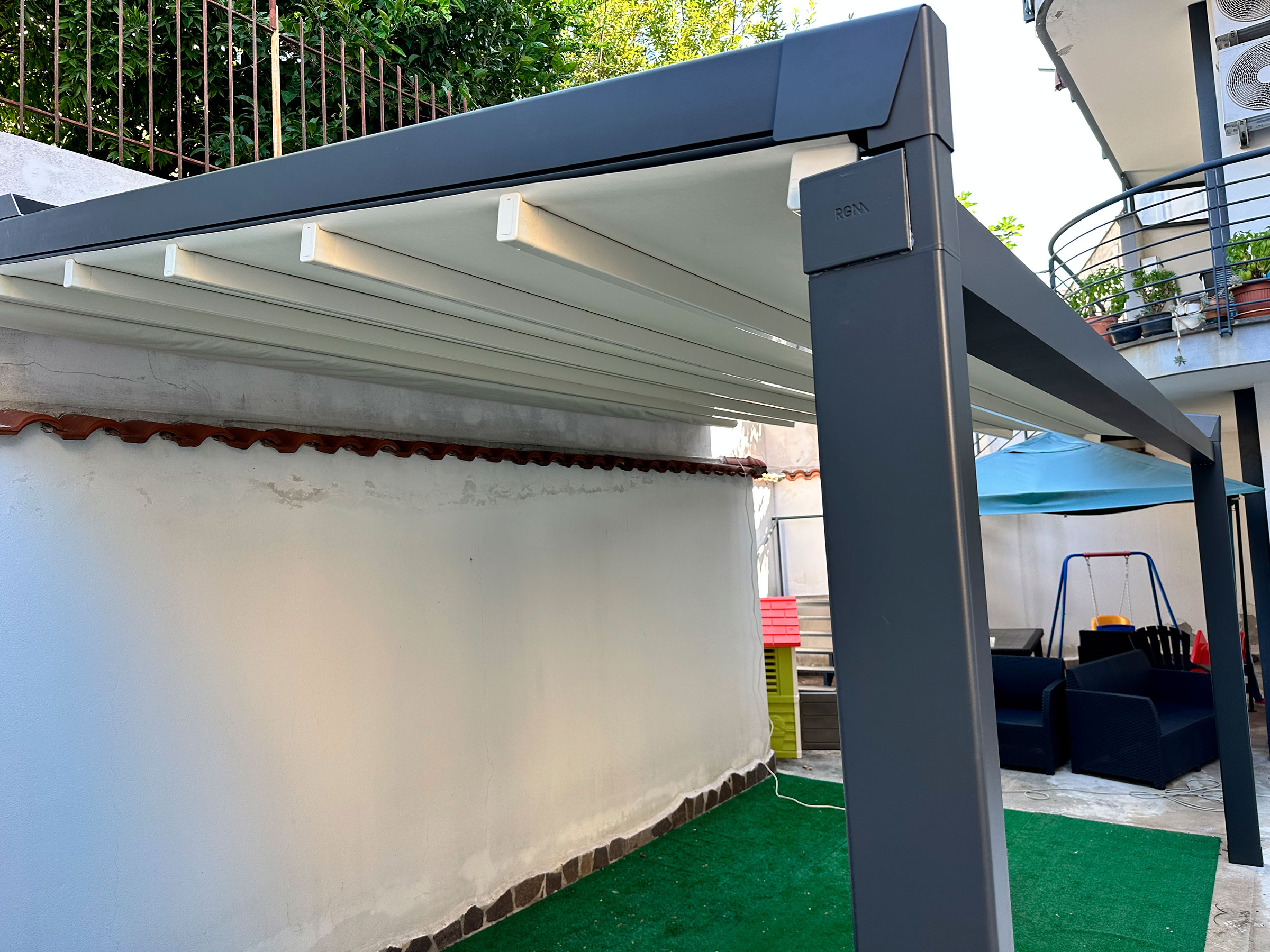 A questi vantaggi si aggiunge la possibilità di arricchire la pergola con illuminazione LED integrata, chiusure laterali in vetro o PVC e sistemi audio, per creare spazi accoglienti e vivibili in ogni momento della giornata. L’installazione professionale curata da Piemme Soluzione Ombra assicura un montaggio preciso, stabile e conforme alle più recenti normative in materia di sicurezza e durabilità.